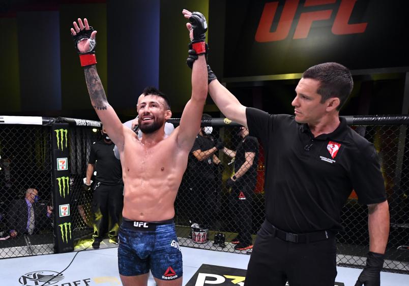 Gutierrez (pictured above) has not been defeated professionally since his UFC debut in November of 2018. Since, he’s gone 4-0-1 with the lone draw coming against Cody Durden in August last year. He came in as the Cage Calculus favorite in four of those five bouts, with his lone upset win being against Ryan MacDonald (he had a 46.9% chance to win that bout).