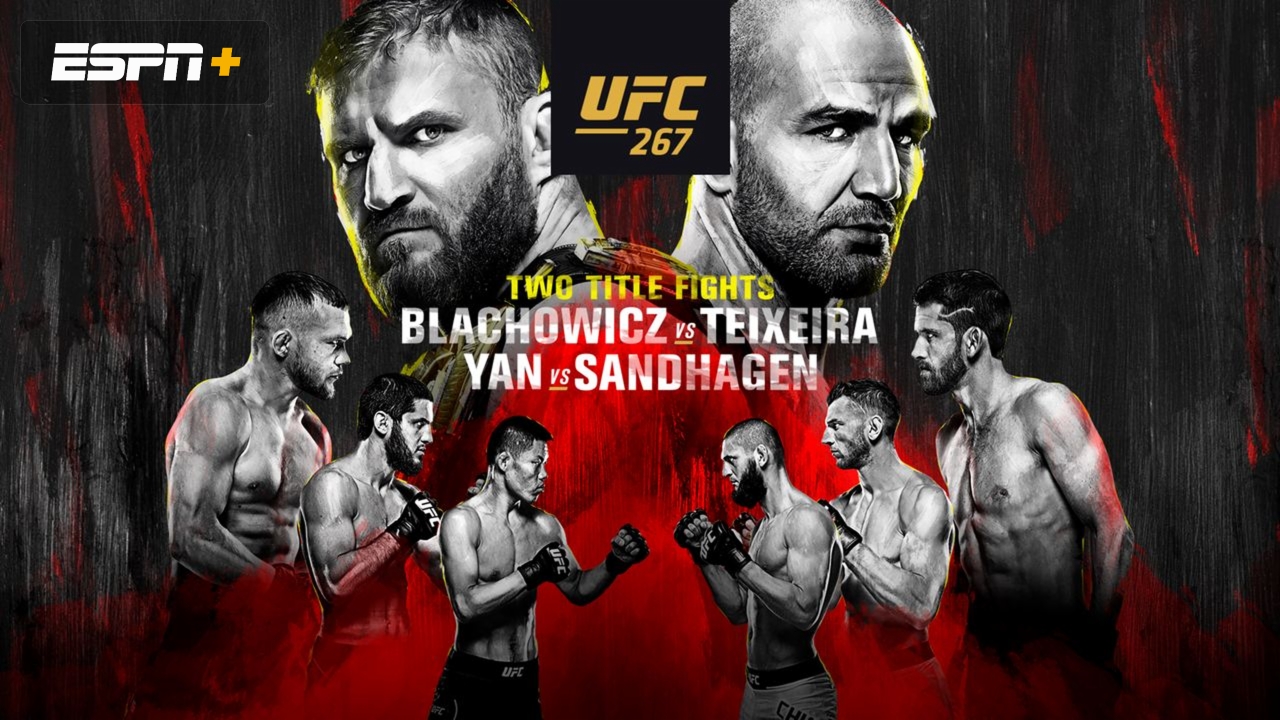 The main slate for UFC 267 features a six fight card. The card is headlined by two title fights. The first is an interim title matchup between former bantamweight champ Petr Yan and contender, Cory Sandhangen. The main event is for the undisputed light heavyweight championship of the world between champion Jan Blachowicz and #1 contender Glover Teixeira. All projections are based off a fighter’s CC rating and their place in the CC rankings.