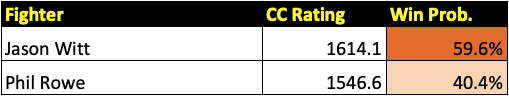 Subjective Spin on Objective Reality: Rowe may be younger, but he is also pretty inexperienced for a 31 year-old fighter. His only UFC win came against Cosce, who is ranked 70th out of 78 UFC welterweights at the moment. Witt is vulnerable to a finish, but he’ll also be able to give Rowe looks he’s maybe not yet seen in the cage. Give the edge to the veteran underdog.