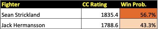 After a two-week hiatus, the UFC is back this weekend for UFC Vegas 47. The UFC Vegas 47 main card features six bouts. It will see the return of undefeated Kazakh prospect Shavkat Rakhmonov and an Ultimate Fighter grudge match between Bryan Battle and Tresean Gore. The card is capped by a matchup between middleweight contenders Jack Hermansson and Sean Strickland. All win probabilities are based on a fighter’s CC Rating and their place in the CC Rankings.
