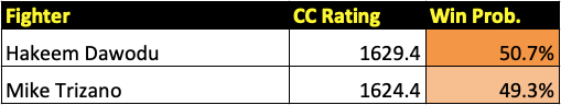 Subjective Spin on Objective Reality: Dawodu’s average opponent is rated 1639.2 by the CC forecast, whereas Trizano’s average opponent is a 1609.1. You have to keep in mind Trizano may be slightly bigger, being the former lightweight, whereas Dawodu is a natural featherweight. Both fighters often win by split decision as well and both are 30 years old. This could not be much closer on paper if you wanted it to be. With all else being equal, trust the forecast and the oddsmakers when they agree.