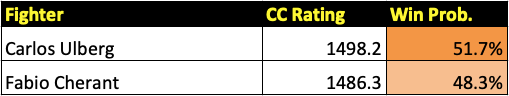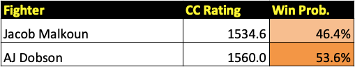 The UFC Vegas 271 prelim card features nine bouts, the first four of which will be previewed in this post. These five fights take place across four different weight classes and features the UFC debut of prospect Mike “Blood Diamond” Mathetha (pictured above). All win probabilities are based on a fighter’s CC Rating and their place in the CC Rankings.