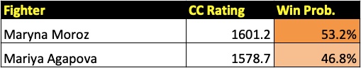 The UFC 272 prelim card features eight bouts, the final four of which will be previewed in this post. It features a pivotal strawweight matchup between contenders Marina Rodriguez (pictured above left) and Yan Xiaonan (pictured above right). All win probabilities are based on a fighter’s CC Rating and their place in the CC Rankings.