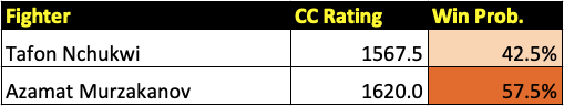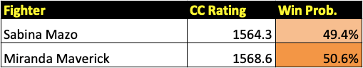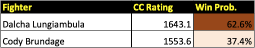 The UFC Vegas 50 prelim card features eight bouts, the first four of which will be previewed in this post. All win probabilities are based on a fighter’s CC Rating and their place in the CC Rankings.