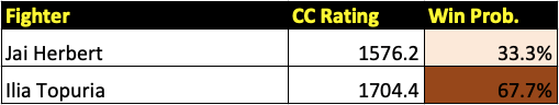 The UFC London main card features six bouts, the first three of which will be previewed in this post. All win probabilities are based on a fighter’s CC Rating and their place in the CC Rankings.