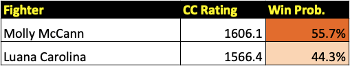 Subjective Spin on Objective Reality: This fight will be close. Carolina has a significant reach advantage, but McCann had a worse discrepancy against Kim and still emerged victorious. McCann may also have the advantage on the ground if she can land an early takedown.