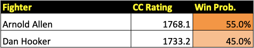 The UFC London main card features six bouts, the final three of which will be previewed in this post. The card is headlined by a heavyweight bout between contenders Alexander Volkov (pictured above upper left) and Tom Aspinall (pictured above upper right). It also features Dan Hooker (pictured above lower right) in his return to featherweight to face Arnold Allen (pictured above lower left). All win probabilities are based on a fighter’s CC Rating and their place in the CC Rankings.