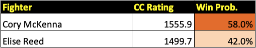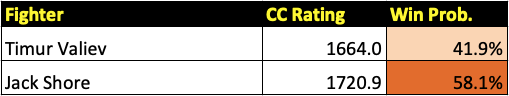 The UFC London prelim card features six bouts, the first three of which will be previewed in this post. All win probabilities are based on a fighter’s CC Rating and their place in the CC Rankings.