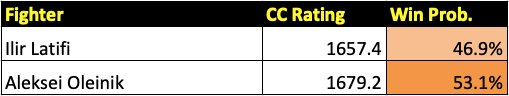 The UFC Columbus main card features six bouts, the first three of which will be previewed in this post. All win probabilities are based on a fighter’s CC Rating and their place in the CC Rankings.