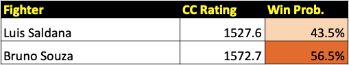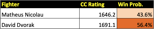 The UFC Columbus prelim card features seven bouts, the first three of which will be previewed in this post. All win probabilities are based on a fighter’s CC Rating and their place in the CC Rankings.