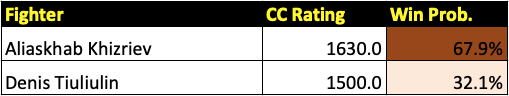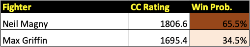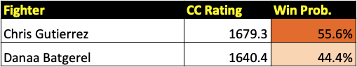 The UFC Columbus prelim card features seven bouts, the final four of which will be previewed in this post. All win probabilities are based on a fighter’s CC Rating and their place in the CC Rankings.