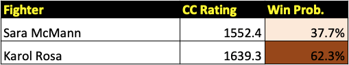 Subjective Spin on Objective Reality: Rosa is a more well-rounded fighter. So long as she mitigates McMann’s takedowns, she will control the fight on the feet and in limited grappling interactions.