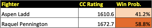 The UFC 273 prelim card features seven bouts, the final three of which will be previewed in this post. It features a pivotal bantamweight matchup between contenders Aspen Ladd (pictured above left) and Raquel Pennington (pictured above right). All win probabilities are based on a fighter’s CC Rating and their place in the CC Rankings.