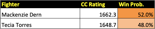 Subjective Spin on Objective Reality: This is a clear battle of styles. Dern’s been tripped up in the past by Rodriguez because of her quickness and ability to stay at range. Amanda Ribas (#8 CC, #9 UFC) had enough defensive wrestling to mitigate Dern. Torres is talented, but hasn’t demonstrated an ability to stop the elite grappling of a black belt like Dern.