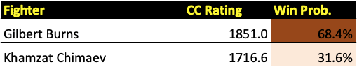 The UFC 273 main card features five bouts, all five of which will be previewed in this post. It is capped the featherweight championship bout between reigning champion Alexander Volkanovski (pictured upper left) and “The Korean Zombie” Chan Sung Jung (pictured above right). It also will see a grudge title unification bout between champion Aljamain Sterling (pictured lower left) and interim champ Petr Yan (pictured lower right) after their controversial bout last year. And, the fight everyone is looking forward to is a pivotal welterweight showdown between Gilbert Burns and Khamzat Chimaev. All win probabilities are based on a fighter’s CC Rating and their place in the CC Rankings.
