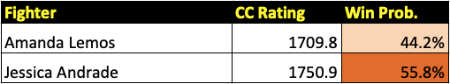The UFC Vegas 52 card features 12 fights, seven preliminary bouts and five main card bouts. It is capped by a crucial strawweight bout between Amanda Lemos (pictured above left) and Jessica Andrade (pictured above right). Due to extraordinary circumstances, these previews will only feature the Cage Calculus forecast, the editor’s pick, and the odds-on Vegas favorite. We will be back to the full write-up previews for next week’s card. All CC projections are based on a fighter’s CC Rating and their place in the CC Rankings.