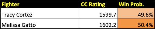 The UFC 274 early prelim card has six bouts across six different weight divisions. It features an important women’s flyweight bout between Tracy Cortez (pictured above left) and undefeated Melissa Gatto (pictured above right). All win probabilities are based on a fighter’s CC Rating and their place in the CC Rankings.