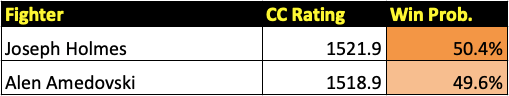 The UFC Vegas 55 prelim card features six bouts, all of which will be previewed in this post. It will be capped by a middleweight matchup between Joseph Holmes and Alen Amedovski and will also feature rising light heavyweight prospect Jailton Almeida (pictured above). All win probabilities are based on a fighter’s CC Rating and their place in the CC Rankings.