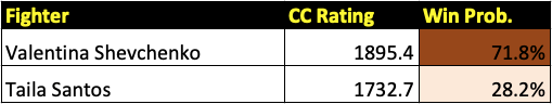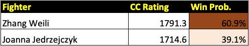 The UFC 275 main card features five bouts, all of which will be previewed in this post. It is headlined by two title bouts. The first is for the women’s flyweight championship between champion Valentina Shevchenko and top contender Taila Santos. The main event is for the men’s light heavyweight title between champion Glover Teixeira and rising Czech star Jiri Prochazka. It will also feature a rematch of 2020’s Fight of the Year between former strawweight champs Zhang Weili and Joanna Jedrzejczyk. All win probabilities are based on a fighter’s CC Rating and their place in the CC Rankings.