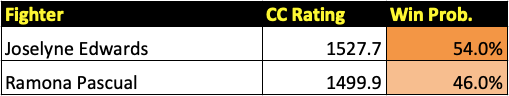 Subjective Spin on Objective Reality: Pascual is a talented prospect. She ought to have a size advantage coming in as well, as Edwards has never fought at featherweight. We may not see either fighter back up their impressive finishing numbers, but expect Pascual to make this a battle, and pull off the upset.