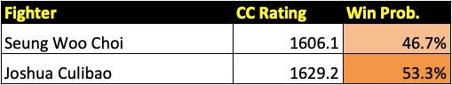Subjective Spin on Objective Reality: Choi is vulnerable on the ground, but Culibao is a Tae-Kwon-Do specialist, and has never submitted anyone. Choi has more experience and should be able to fight on his terms.