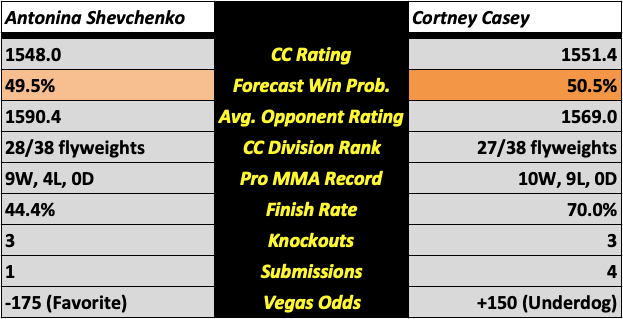 The UFC Vegas 58 prelim card features six bouts, all of which will be previewed in this post. It will feature a women’s flyweight bout between Antonina Shevchenko (pictured above) and Cortney Casey. It’ll be capped by a bantamweight bout between Aiemann Zahabi and former TUF winner Ricky Turcios. All win probabilities are based on a fighter’s CC Rating and their place in the CC Rankings.
