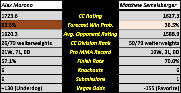 Subjective Spin on Objective Reality: Morono comes in on a three-fight win streak, having kicked it off by knocking out Donald “Cowboy” Cerrone on short notice in the very first round. Despite having an equal number of KOs and submissions, Morono’s last three finishes have come by KO, not having secured a submission since 2018. For his part, “Semi the Jedi” comes in with a 4-1 record in the UFC. Two of those four wins came by KOs that happened in under 20 seconds. If he catches you, he has enough power to put you out. This is a close fight on paper and the big distinguishing factor may be Morono’s experience.