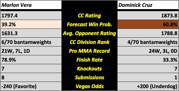 The UFC San Diego main card features six bouts, all of which will be previewed in this post. It will be capped by a pivotal bantamweight matchup between rising Ecuadorian contender Marlon “Chito” Vera (pictured above left) and former bantamweight champion Dominick Cruz (pictured above right). All win probabilities are based on a fighter’s CC Rating and their place in the CC Rankings.