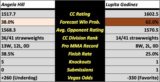 The UFC San Diego prelim card features seven bouts, all of which will be previewed in this post. It will be capped by a 120 pound catchweight bout between strawweight contenders, Angela Hill (pictured above left) and Lupita Godinez (pictured above right). All win probabilities are based on a fighter’s CC Rating and their place in the CC Rankings.