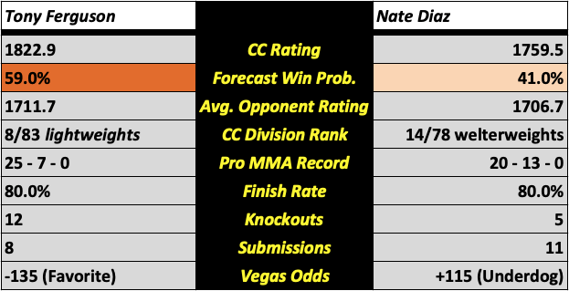 The UFC 279 early main card features five bouts, all of which will be previewed in this post. After much drama, and some matchmaking musical chairs by the UFC, the main event will be a welterweight bout between Nate Diaz (pictured above left) and Tony Ferguson (pictured above right). The co-main will feature a 180 pound catchweight bout between Khamzat Chimaev and Kevin Holland. All win probabilities are based on a fighter’s CC Rating and their place in the CC Rankings.