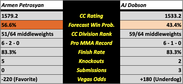 Subjective Spin on Objective Reality: Petrosyan drew a short straw in his UFC debut, facing the uber-talented Caio Borralho (who will also fight at UFC 280). He gets a chance to redeem himself and display his KO power that’s led him to finishes in five of his six pro fights. Dobson, on the other hand, typically varies his finishes. He is somewhat of a submission threat. If he can go through the fire and survive, he should be able to control Petrosyan on the ground or in the clinch and bank a round or two, or even search for the finish himself.
