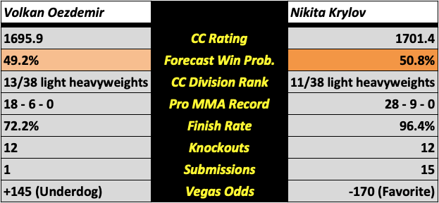 Subjective Spin on Objective Reality: Oezdemir (#12 CC, #8 UFC) has faced a murderer’s row of the light heavyweight division in his last four fights, taking on four top 10 fighters, with three being in the top 5 (including current champion Jiri Prochazka). He’s come out 2-2 in those bouts. Despite his 3-5 record in his last eight bouts, he’s been better than his record and has beaten lower output fighters. Krylov (#10 CC, #10 UFC) is not one such guy. He has an absurdly high finish rate, given the number of fights he’s had in his career. He can truly get you from anywhere. He has heavy hands and an outstanding submission game. There’s nowhere for a fighter like Oezdemir to get comfortable.