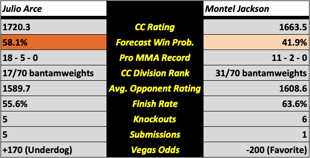 Subjective Spin on Objective Reality: Arce has battled time and a lot of inconsistency as of late. He’s also benefitted from a relatively easy schedule for a fighter of his rating. His early career performance keeps his CC rating hanging just around the top 15, but that won’t be the case for much longer if he can’t string together some wins. Jackson is 5-2 in the UFC and has won two straight. If he is, in fact, coming into his prime, this would be a statement win over a veteran like Arce. He does have to watch out for Arce’s grappling, as Arce is the greater submission threat.