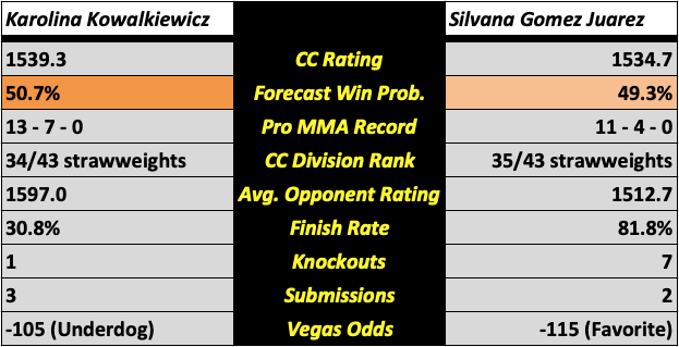 Subjective Spin on Objective Reality: Kowalkiewicz finally snapped a five-fight losing streak her last time out, sending Felice Herrig into retirement with a second round submission. Few fighters come into the cage with as much joy and enthusiasm as Kowalkiewicz. She likely will never get back to a level where she’s contending for a title again, but she proved that after some needed time off, she still has something to offer the division. Gomez Juarez, on the other hand, is relatively new to the promotion, despite being as old as the veteran Kowalkiewicz. Her power rivals most others in the division. Her flaw has typically been overextending herself trying to get the KO and getting finished herself (of her four losses, she’s been finished three times). This should be something a veteran like Kowalkiewicz, who’s fought at the highest levels in the sport, should be able to recognize with ease.