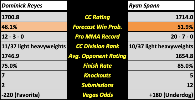 Subjective Spin on Objective Reality: The UFC can be an unkind sport. However, it’s perhaps been unkindest of all to Reyes (#10 CC, #7 UFC) lately. Reyes fought legend and possible greatest of all-time, Jon Jones, to a razor thin decision that many believe Reyes should have won. Reyes then got another title shot after Jones vacated, but was finished by Jan Blachowicz (#1 CC, #2 UFC). Reyes then tried to turn things around, but was put to sleep by now-current champion Jiri Prochazka. He’s fought perhaps the toughest three-fight stretch that anyone has ever had. It gets easier, but not by much against Spann (#9 CC, #12 UFC). Spann is an imposing figure, scary in the standup but has made most of his success in the submission game. This would be his most impressive win to date. However, let’s not let this losing streak distract from the fact that Reyes is as good a light heavyweight as there is. He should return to the win column tonight.