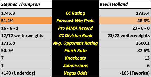The UFC Orlando main card features six bouts, all of which will be previewed in this post. It will be headlined by a welterweight matchup between veteran striker and two-time title challenger Stephen “Wonderboy” Thompson (pictured above left) and rising contender, Kevin Holland (pictured above right). It will also feature a huge heavyweight showdown between accomplished knockout artists Tai Tuivasa and Sergei Pavlovich. All win probabilities are based on a fighter’s CC Rating and their place in the CC Rankings.