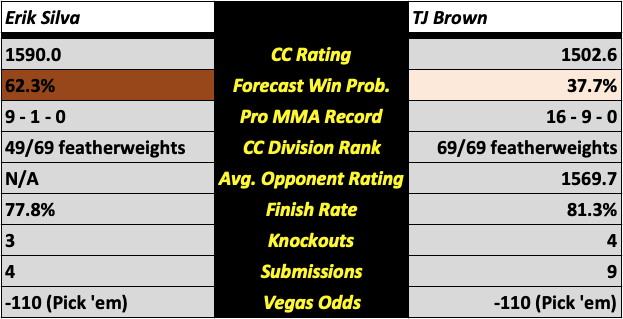 Subjective Spin on Objective Reality: This is a low-key great matchup between two well-rounded fighters who find themselves in very different positions. The Venezuelan Silva is making his UFC debut after winning the Lux Fight League featherweight title and getting a first round finish on Dana White’s Contender Series. Brown, on the other hand, is 2-3 in his UFC career and currently finds himself dead last in the Cage Calculus divisional rankings. Oddsmakers say this is a toss-up. Give the tie to the fighter with the higher finishing rate and more experience. Brown likely doesn’t belong all the way in the basement. A win here should bring his rating up to about where it belongs in the grand scheme.