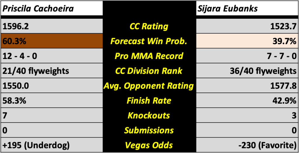 The UFC Vegas 67 prelim card features seven bouts, three of which will be previewed in this post. It will feature a women’s flyweight bout between Priscila Cachoeira and Sijara Eubanks (pictured). All editor’s picks and analysis can be found in the video below. All win probabilities are based on a fighter’s CC Rating and their place in the CC Rankings.