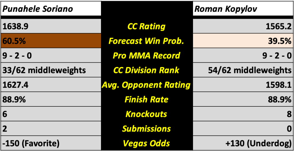 The UFC Vegas 67 main card features five bouts, this post will preview the high powered middleweight bout between Punahele Soriano (pictured) and Roman Kopylov. Both men boast extremely high finish rates. All editor’s picks and analysis can be found in the video below. All win probabilities are based on a fighter’s CC Rating and their place in the CC Rankings.