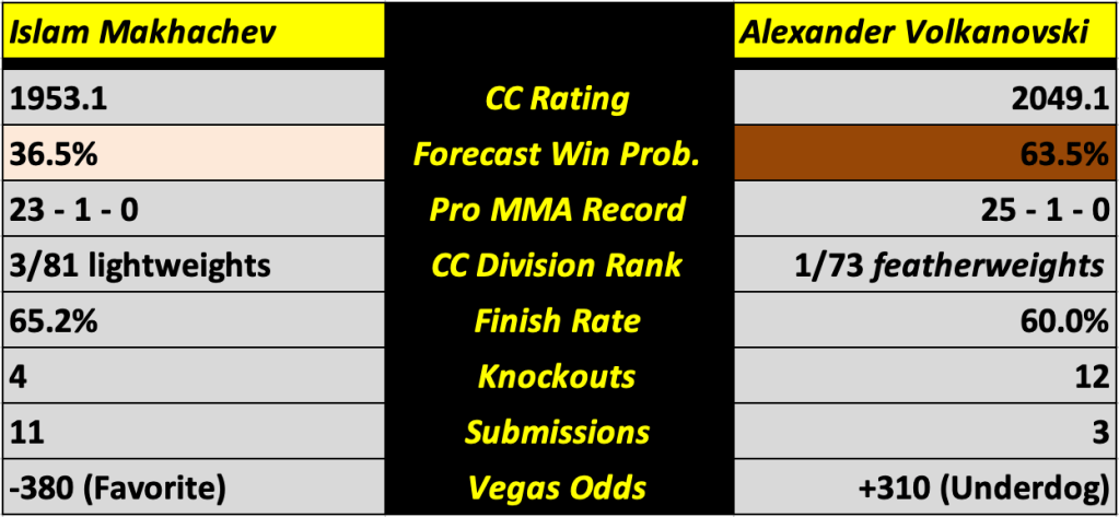 The UFC 284 card features thirteen bouts, all of which will be previewed in this post. It will be headlined by a bout between lightweight champion Islam Makhachev (pictured left) and featherweight champion Alexander Volkanovski (pictured right) for the lightweight title. It’s the first time in UFC history that the promotion’s #1 and #2 pound-for-pound fighters will face off against each other. All win probabilities are based on a fighter’s CC Rating and their place in the CC Rankings.