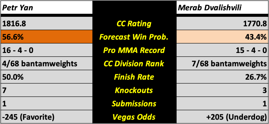 The UFC Las Vegas card features thirteen bouts, all of which will be previewed in this post. It will be headlined by a key bantamweight matchup between former champion Petr Yan (pictured left) and rising Georgian contender Merab Dvalishvili (pictured right). It will also featured a co-main event between hard-hitting heavyweight contenders Alexander Volkov and Alexandr Romanov. All win probabilities are based on a fighter’s CC Rating and their place in the CC Rankings.