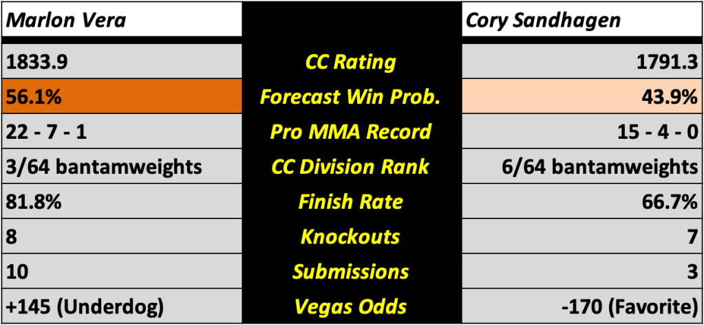 The UFC San Antonio card featured ten bouts, all of which will be “previewed” in this post. It will be headlined by a key bantamweight matchup between former interim title challenger Cory Sandhagen (pictured right) and rising Ecuadorian contender Marlon Vera (pictured left). Due to technical difficulties, these previews are being posted after the fact for posterity, but all picks and forecasts are retroactive to before the fights took place. All win probabilities are based on a fighter’s CC Rating and their place in the CC Rankings.