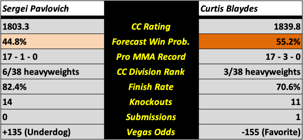 The UFC Vegas 71 card features eleven bouts, all of which will be previewed in this post. It will be headlined by a pivotal matchup of top heavyweight contenders, Curtis Blaydes (pictured right) and Sergei Pavlovich (pictured left). All win probabilities are based on a fighter’s CC Rating and their place in the CC Rankings.