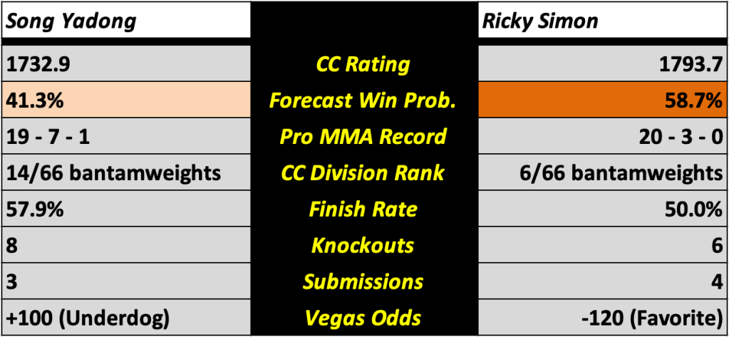 The UFC Vegas 72 card featured eleven bouts, all of which will be “previewed” in this post. It will be headlined by a key bantamweight matchup between contenders Song Yadong (pictured left) and Ricky Simon (pictured right). Due to scheduling difficulties, these previews are being posted after the fact for posterity, but all picks and forecasts are retroactive to before the fights took place. All win probabilities are based on a fighter’s CC Rating and their place in the CC Rankings.