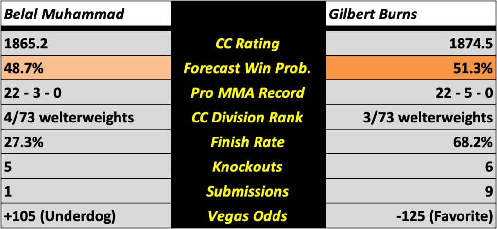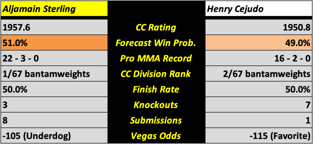 The UFC 288 card features twelve bouts, all of which will be previewed in this post. It will feature a short-notice welterweight showdown in a potential title eliminator between Belal Muhammad and Gilbert Burns. It will be headlined by a bout between bantamweight champion Aljamain Sterling (pictured left) and returning former two-division champion and Olympic gold medalist, Henry Cejudo (pictured right). All win probabilities are based on a fighter’s CC Rating and their place in the CC Rankings.