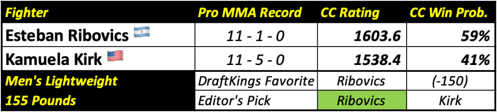 Kirk is coming up from featherweight for this fight. This’ll be a tough matchup, as Ribovics is able to control larger fighters well and mitigate good wrestling. Kirk’s known for his wrestling, but has shown little of that if at all at the UFC level.