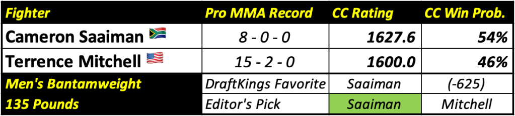 Mitchell will take this fight on short notice against an undefeated Saaiman. Mitchell is coming from Alaska FC, not known for top tier competition. Saaiman does have to work on avoiding fouls in the octagon, but there is no doubt who will be more skilled and well-prepared in there at UFC 290.