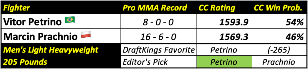 Prachnio started his UFC career by getting KO’d in the first round in three straight. He’s recovered by winning three of his last four. However, Petrino is young, has immense power, and a four-inch reach advantage. Petrino is the type of fighter made to KO fighters like Prachnio. Prachnio’s leg kicks won’t save him.