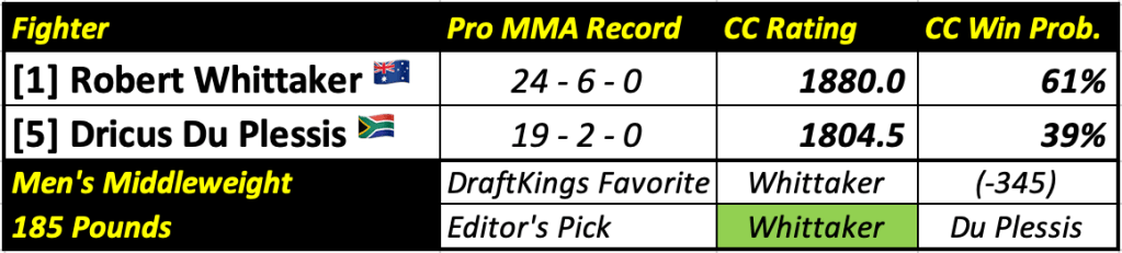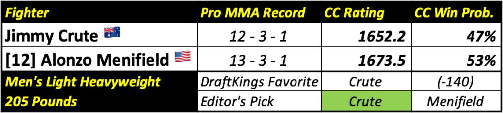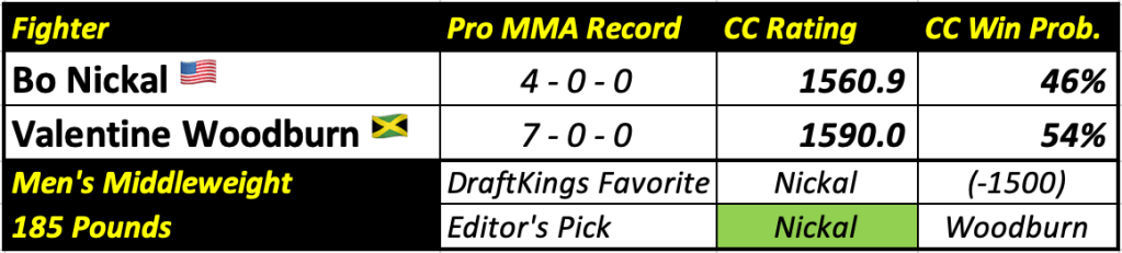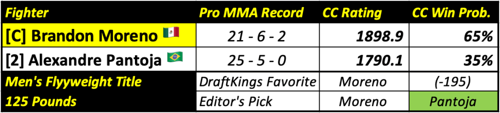 All win probabilities are based off of a fighter’s Cage Calculus (CC) Rating and their place in the CC Rankings. The fighter’s name highlighted in green at the bottom of the panel indicates the editor’s pick to win. Any number in brackets to the left of a fighter’s name indicates their ranking in the CC Rankings, not the official UFC Rankings.