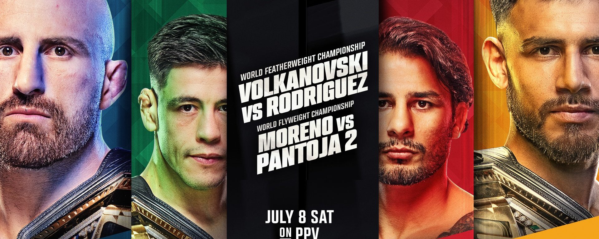 The UFC 290 card features thirteen bouts, all of which will be previewed in this post. It sees two title fights capping a stacked main card. The first is for the men’s flyweight title between champion Brandon Moreno and Brazilian challenger Alexandre Pantoja. The main event is for the unification of the men’s featherweight title between champion Alexander Volkanovski and interim champion Yair Rodriguez.